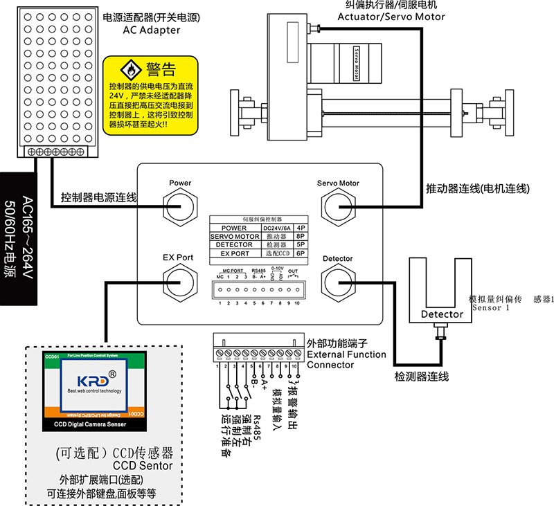 6、 带有3路高速模拟量输入,可同时连接两个模拟量传感器和一路外控模拟量(例如微调位置,蛇形速度等)
